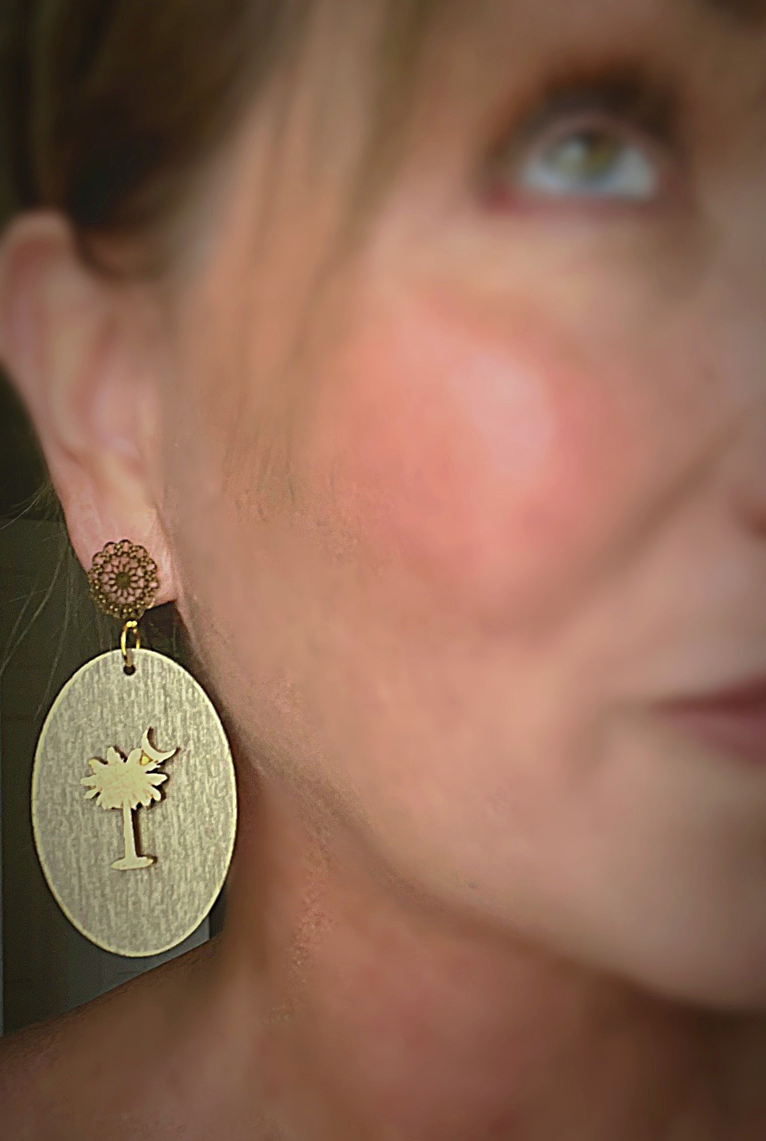 Lightweight, gold oval with gold palmetto tree and gold stud.Height 3” width 2”