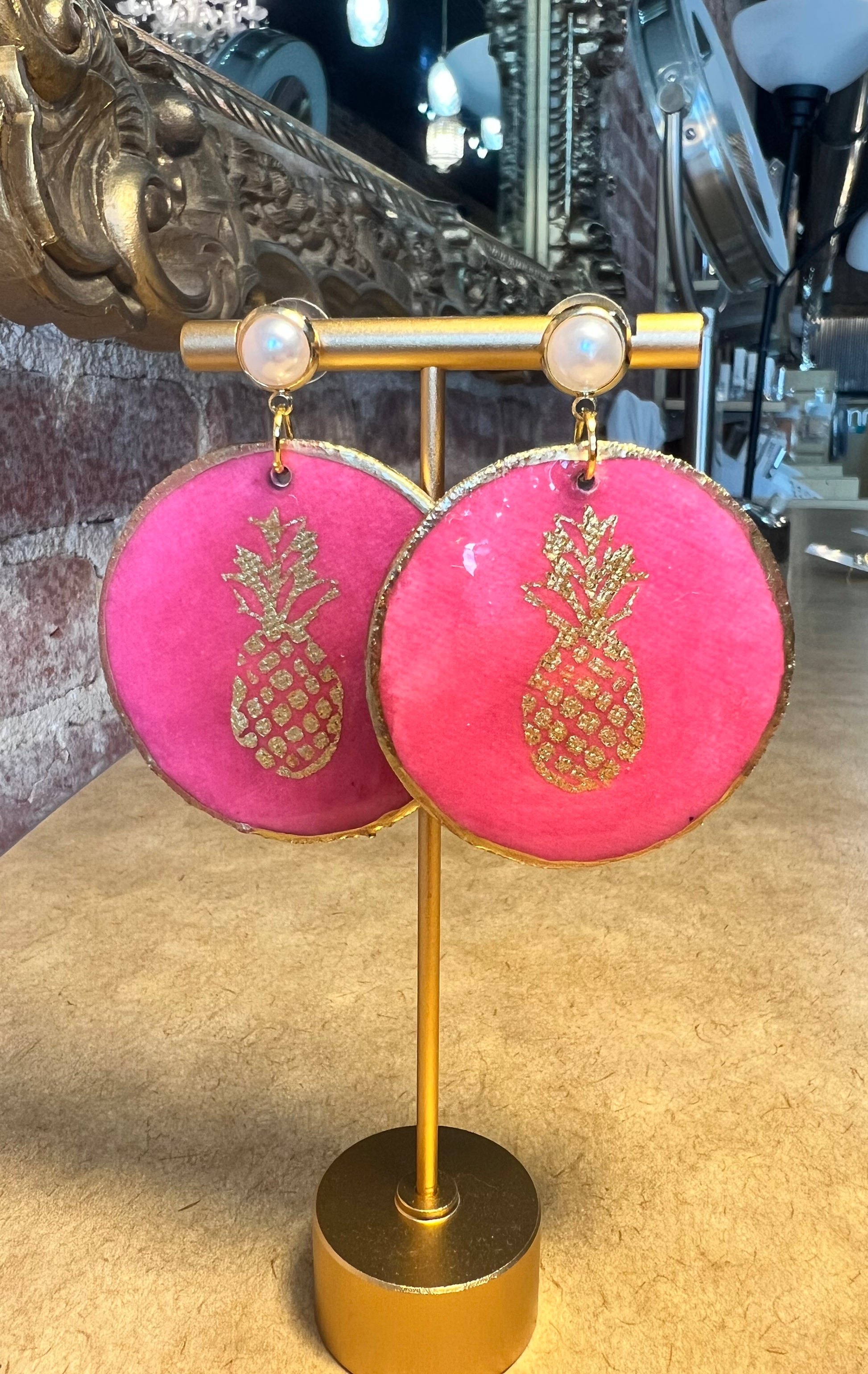 Lightweight, pink and gold pineapple on round disc with pearl and gold stud.
