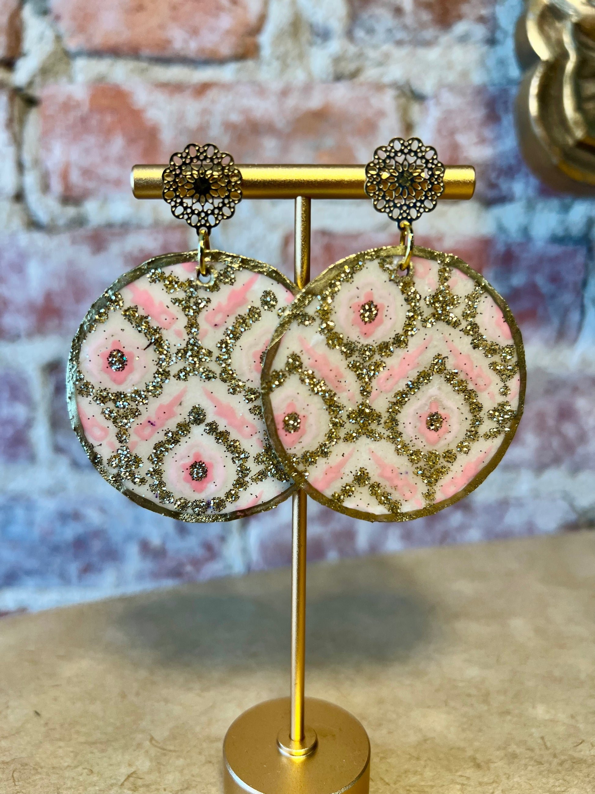 Lightweight, pink, cream and gold shimmer with gold filigree stud on round disc.